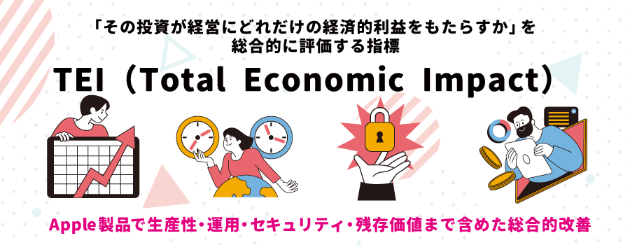 実際、Mac導入でIT効率や生産性が改善したとする分析は複数報告されています。米国Forrester社の調査によると、単なる導入費用だけでなく、生産性向上やリスク軽減までを数値化して「その投資が経営にどれだけの経済的利益をもたらすか」を総合的に評価する指標(TEI=Total Economic Impact)は、生産性・運用・セキュリティ・残存価値まで含めた総合的改善を示しています